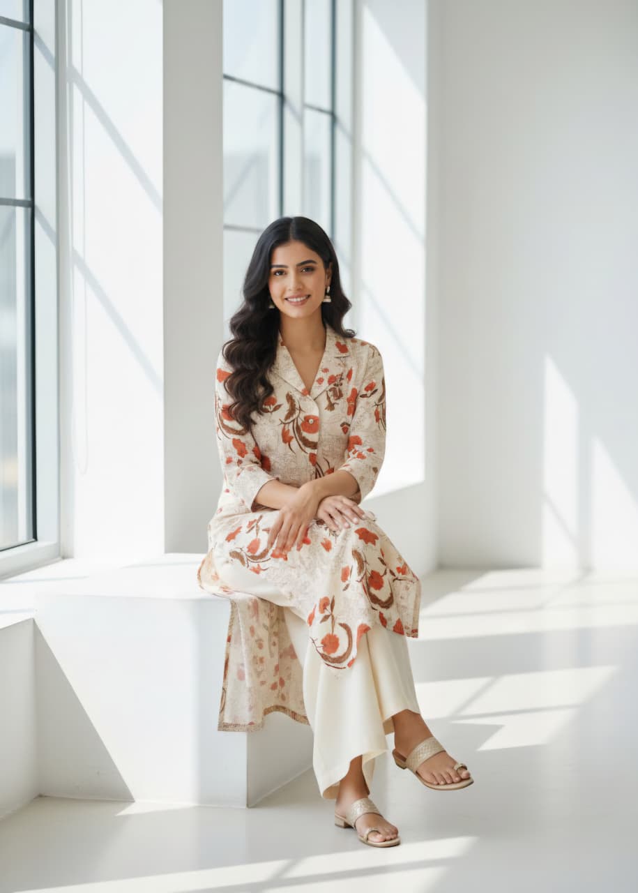 A luxurious printed kurti set crafted in rich fabric, designed for effortless elegance and refined comfort.