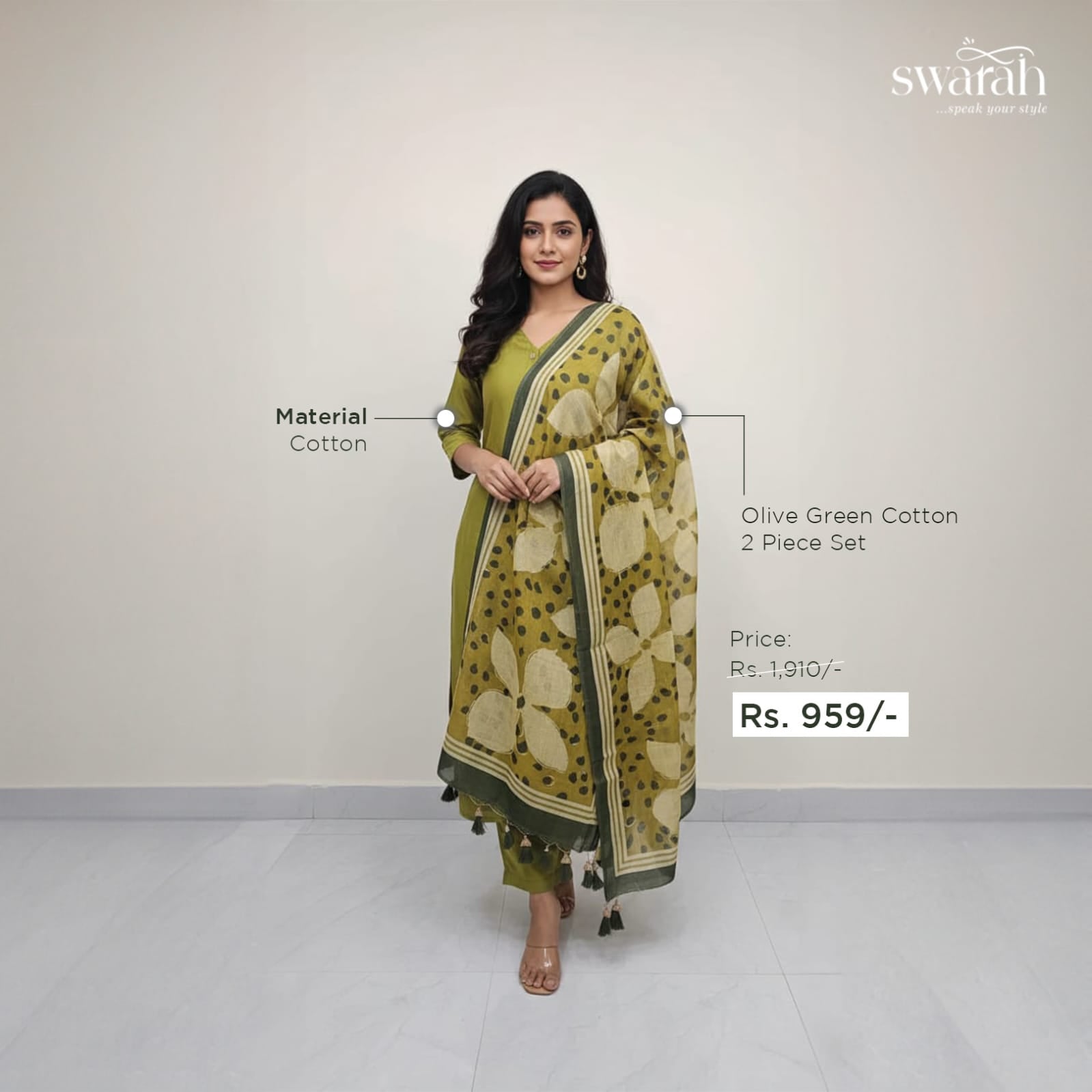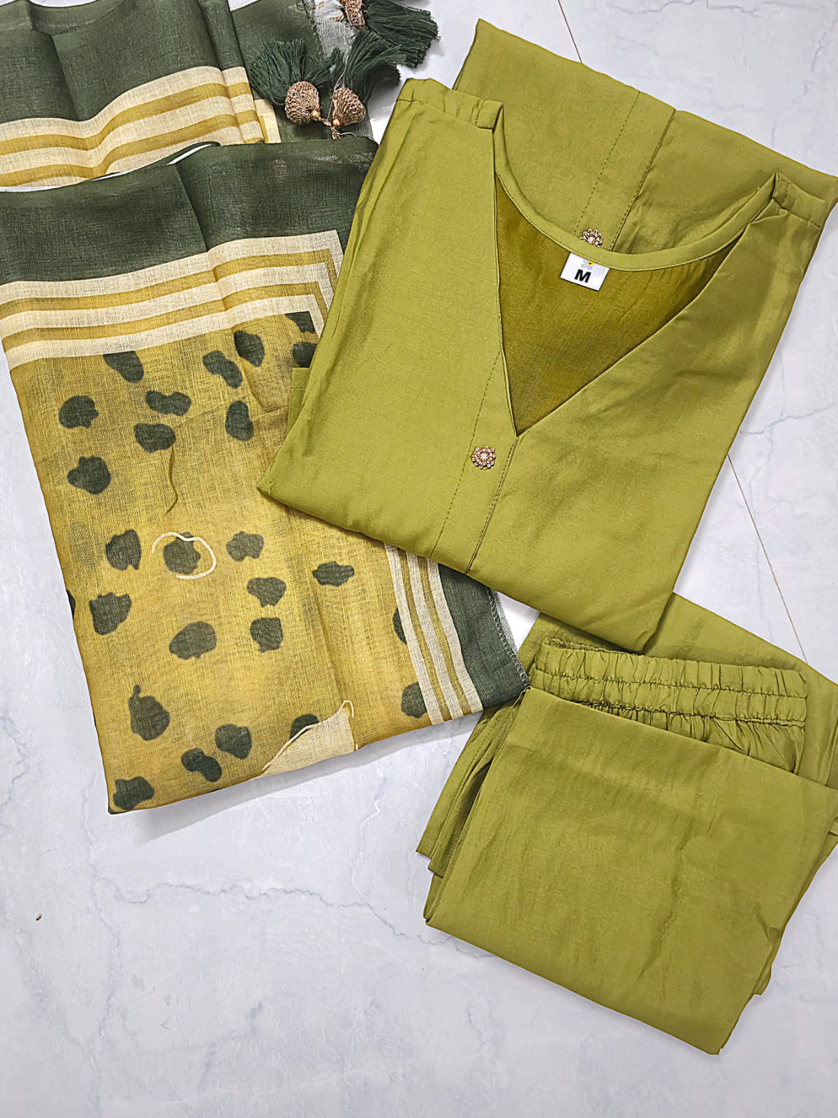 Simple yet elegant olive green cotton set with pant and printed dupatta